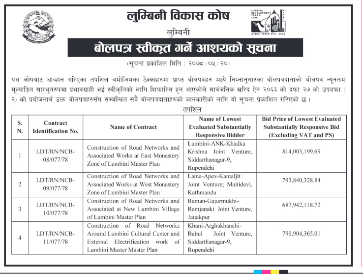 २० भदौ, काठमाडौं । लुम्बिनी विकास कोषले पूर्वमिलेमतोअनुसार नै नै ठेक्का लाग्ने भएको छ । १० जेठ २०७८ गते कोषले आहृवान गरेको ४ वटा टेन्डरमा प्रतिस्पर्धा सीमित गरिएको भन्दै नेपाल निर्माण व्यवसायी महासंघ नै विरोधमा उत्रिएको थियो । तर, कोषले विरोधकै बीचमा पनि ठेक्का प्रक्रिया अघि बढाउँदै आइतबार बोलपत्रको ‘आर्थिक मूल्यांकन’ सकेर छनोट भएका कम्पनीको […]