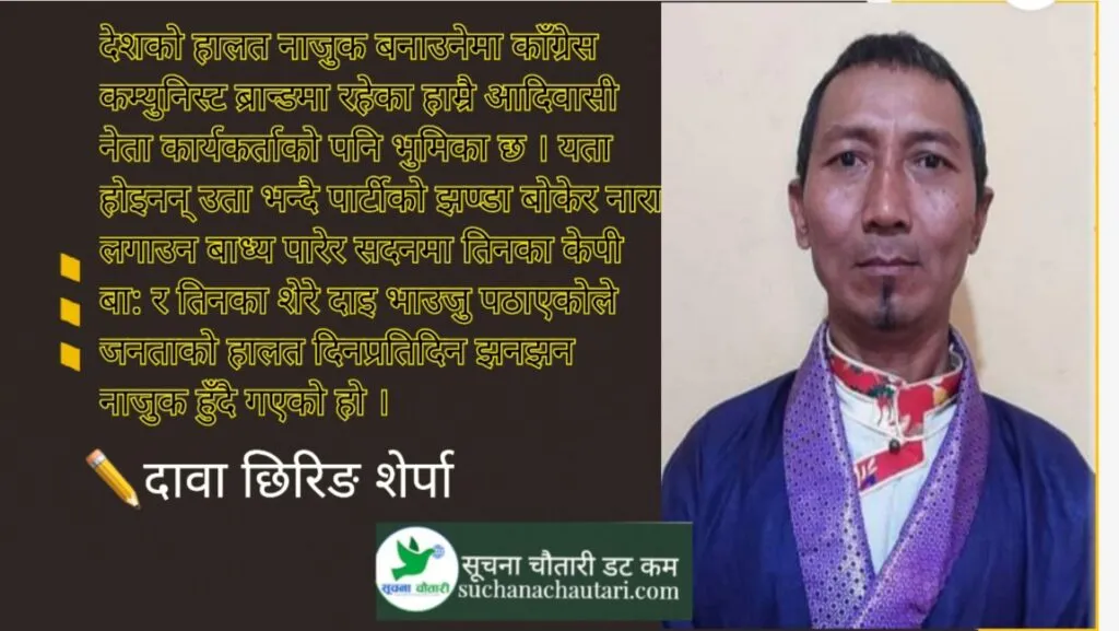 दावा छिरिङ शेर्पा 🖊️ हामी यतातिर थोरै समय दिएर पढौं, समयको खेल हो के थाहा भाेली तपाईंको काँधमा पनि जिम्मेवारी थपिन सक्छ । हामी देश परिवर्तन हुने भरोसामा धेरै दलहरुलाई भोट दिएर सदनमा पठायौं, तर कसैले आम नेपाली जनताको लागि कुनै सुबिधाजन्य सेवा प्रवाहित गर्न र गराउन सकेको छैनन् सकिदैन पनि किन भने हामीले चुनेको […]