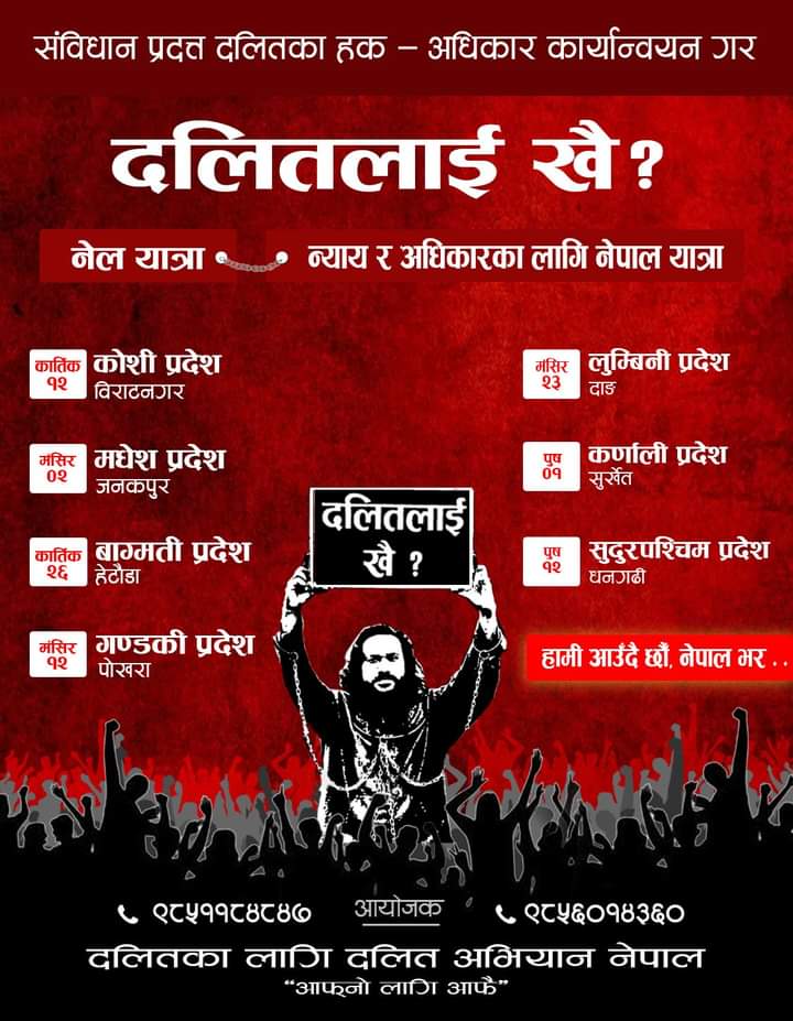 काठमाडौं । गत भदाै महिनाभर काठमाडौंको माईतिघर मण्डलामा नेल सहित ” दलितलाई खै “ भन्दै आन्दाेलन गरेर “असाेज ३ एक्क छिन “ काे विशाल प्रदर्शन गरेका ( दलितका लागि दलित ) अभियायनका संयाेजक खगेन्द्र सुनारले अर्काे आन्दाेलनकाे घाेषणा गरेका छन्। कार्तिक १२ गत्ते काेशी प्रदेशकाे बिराटनगरबाट सुरु हुने उक्त नेल सहितकाे यात्रा कार्तिक २६ गत्ते […]
