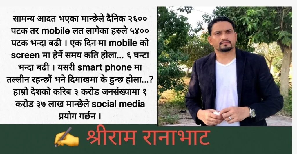 सामन्य आदत भएका मान्छेले दैनिक २६०० पटक तर mobile लत लागेका हरुले ५४०० पटक भन्दा बढी । एक दिन मा mobile को screen मा हेर्ने समय कति होला… ६ घन्टा भन्दा बढी । यसरी smart phone मा तल्लीन रहन्छौं भने दिमाखमा के हुन्छ होला…? हाम्रो देशको करिब ३ करोड जनसंख्यामा १ करोड ३७ लाख मान्छेले […]