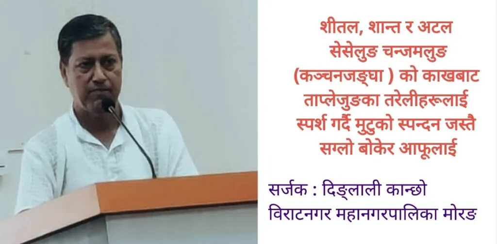 ( कविता ) शीतल, शान्त र अटल सेसेलुङ चन्जमलुङ (कञ्चनजङ्घा ) को काखबाट ताप्लेजुङका तरेलीहरूलाई स्पर्श गर्दै मुटुको स्पन्दन जस्तै सग्लो बोकेर आफूलाई ओरालो झरेर यात्रा सुरू गर्यौ हिंडिरह्यौ अविरल आरोह अवरोह छिचोल्दै जिन्दगीलाई गन्तव्यमा पुर्याउन। पच्चीसको वयमा बिस्कुनले थिचिएका खुशीहरू बोकेर विराटनगरको माटोलाई साक्षी राख्दै […]
