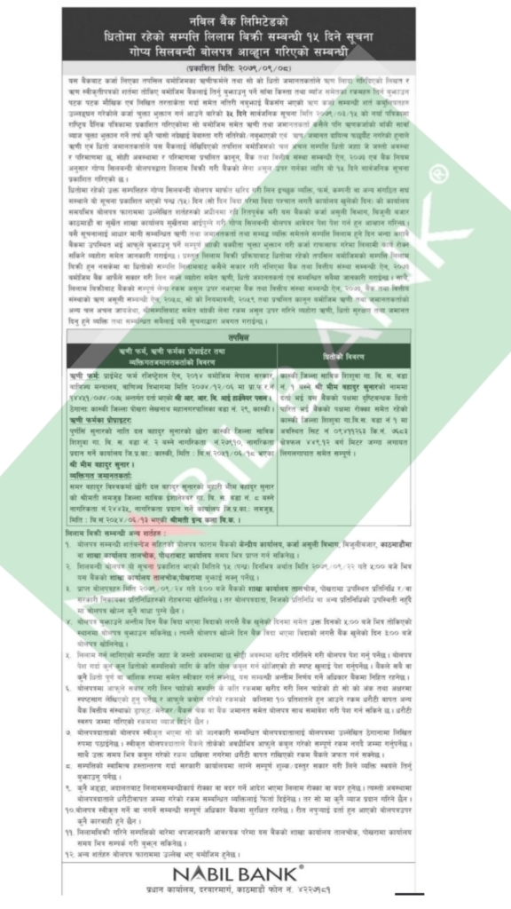 काठमाडौं । नबिल बैंकले धितोमा राखिएको सम्पत्तिहरू लिलामीमा बिक्री गर्ने भएको छ । बैंकबाट लिएको कर्जावापत बैंकलिई बुझाउनुपर्ने साँवा किस्ता तथा व्याज समेतका रकमहरु तिर्न बुझाउन पटक-पटक ताकेता गरे पनि ऋणीले कर्जा तिर्न वेवास्ता गरेपछि बैंकले धितो राखिएको सम्पत्ति बिक्री गर्न लागेको हो । कर्जा चुक्ता भुक्तान गर्न आउने ३५ दिने सार्वजनिक सूचना जारी गर्दा […]