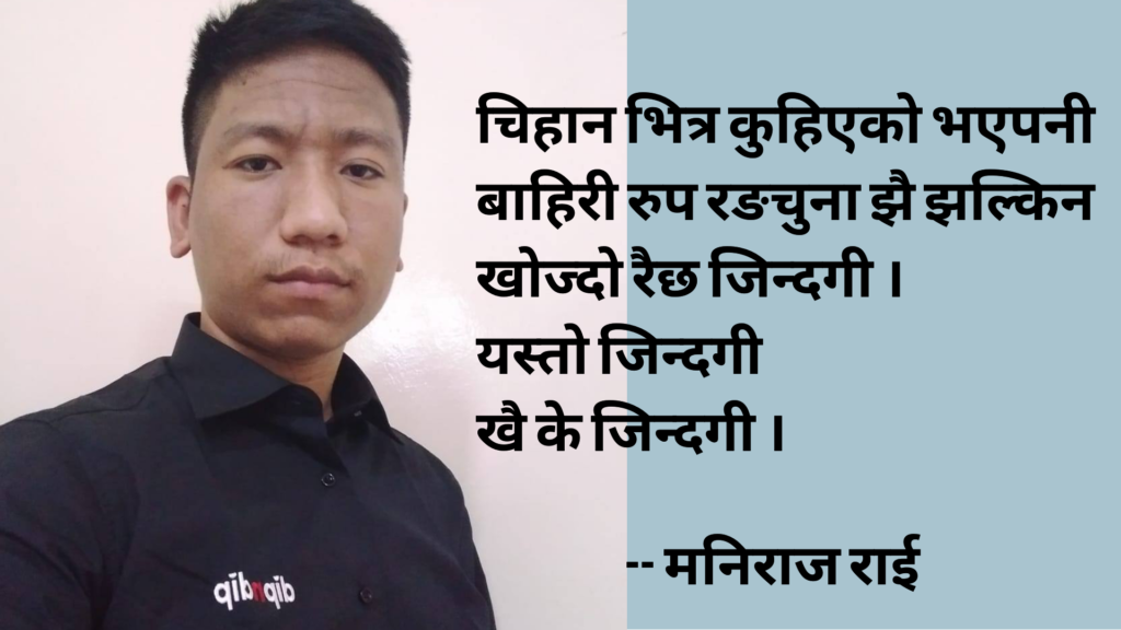 –मनिराज राई हावाको झोक्का मा कुनैबेला बतासिदो रैछ जिन्दगी । देखि धेर बिपत्ती कतै अनायासै हतासिदो रैछ जिन्दगी । कठिन , मुस्किल बहाब मा पनि बगाउनु पर्ने रैछ जिन्दगी । भुमरिरुपी आधिमा चलाएझै नाउ झै खियाउनु पर्ने रैछ जिन्दगी । दुख पिएर , मुस्कान देखाइ जिउनु पर्ने रैछ जिन्दगी । पुरानै किन नहुन तरै टालटुल […]