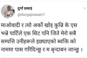 ‘अरुको भन्दिन माओवादी र नेकपा एस भन्ने नक्कली कम्युनिष्ट पार्टीहरूले नेपालको कुनै पनि निर्वाचन क्षेत्रबाट एक मात्र पनि सिट जितेछन् भने मेरो सम्पूर्ण सम्पत्ति तिनीहरूले इच्छ्याइएको व्यक्तिको नाममा पास गरेर सन्यास ग्रहण गरेर बृन्दावन जानेछु । मेरो यही भनाइलाई प्रमाण मानेर दाबी लिए पुग्छ ।’ उनले भनेको यो भाषण सामाजिक संजालमा निकै भाइरल भयो ।