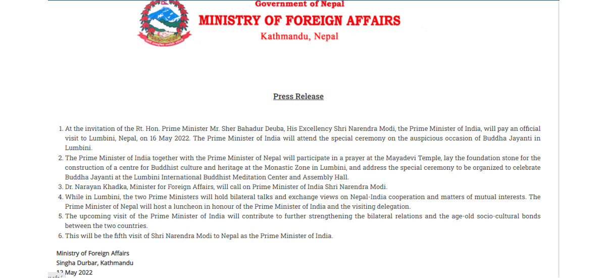 प्रधानमन्त्री शेरबहादुर देउवा र परराष्ट्रमन्त्री डा. नारायण खड्काले भने लुम्बिनीमै पुगेर मोदीसँग भेटवार्ता गर्नेछन् । बुद्ध पूर्णिमाका अवसरमा मोदी लुम्बिनी आउन लागेका हुन् । उनले लुम्बिनीमा आयोजना हुने बुद्ध जयन्तीको विशेष कार्यक्रममा सहभागिता जनाउनेछन् ।