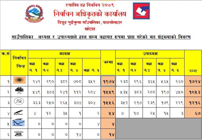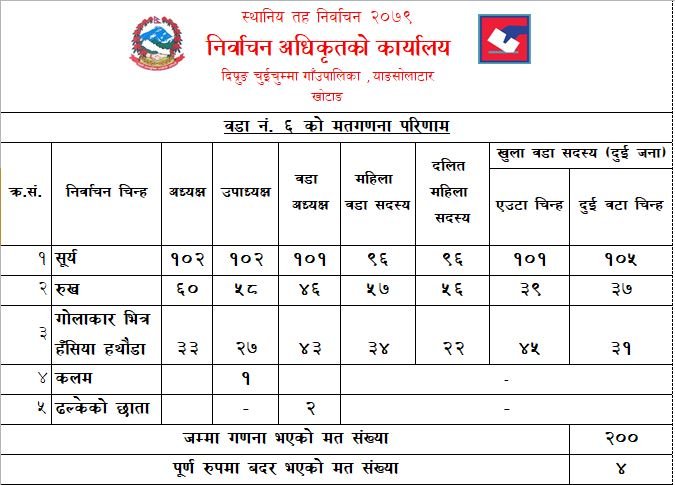 अहिले दिप्रुङ चुईचुम्मा गाउँपालिकाको १, २, ३, ४, ५ र ६ वडाको मतपरिणाम सार्वजनिज भएको छ ।