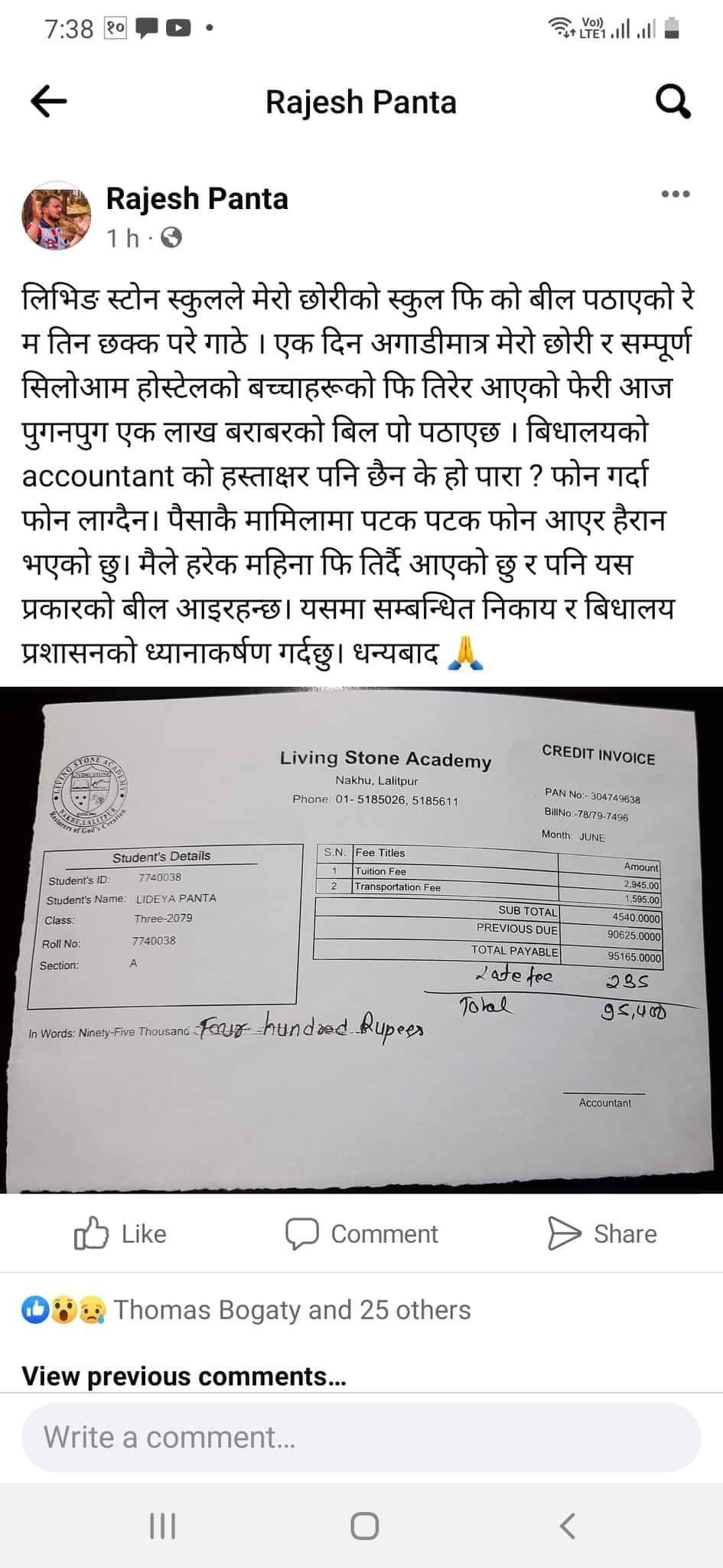 गत शुक्रवार बेलुकी सोहि स्कुलमा अध्ययनरत बिध्यार्थी लिडिया पन्तको नाममा स्कुलले जारी गरेको स्कुलको विल सोही विद्यार्थीका अभिभावक राजेश पन्तले आफ्नो फेसबुक स्टाटसमा स्कुलको मासिक शुल्कको सन्दर्भमा चित्तनबुझेको र स्कुल प्रशासनसँग सम्पर्क गर्दा फोन सम्पर्क नभएको भनी विषय उठान गरएपछि रातोपाटी न्यज डट कमले ख्रीष्टियन स्कुल लिभिङ स्टोन एकेडेमीले मनपरी शुल्क असुल्दै, सरकारसँग नियमन गर्ने ल्याकत नै छैनू भन्ने शिर्षकमा समाचार लेख्यो।https://ratopatinews.com/?p=21033