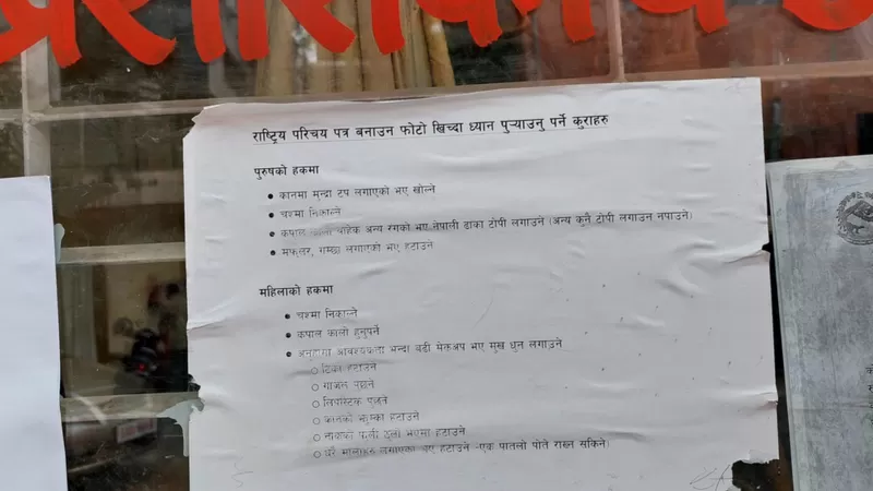 यद्यपि, यस सम्बन्धी कार्यविधि र मापदण्डहरू भने राष्ट्रिय परिचय पत्र विभागले नै सीडीओ कार्यालयमा पठाउने उनले बताइन्। हामीले त कार्यालय परिसरमा विभागको लागि फोटो खिच्ने ठाउँ उपलब्ध गराएको मात्र हो। उहाँहरूले नै तय गर्नु भएको मापदण्ड टाँसिएको छ, उनले भनिन्।