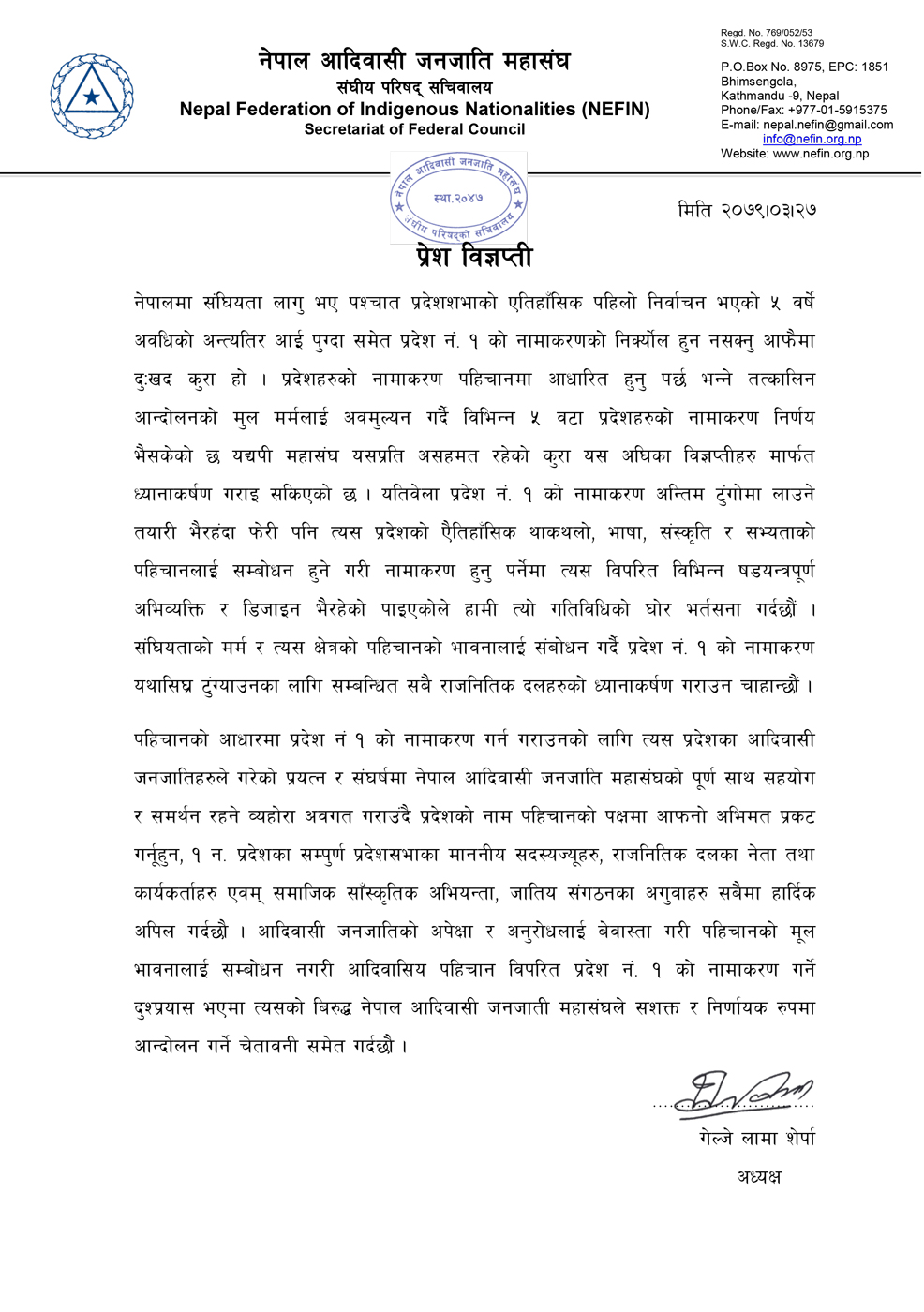 प्रदेश १ प्रदेश सभाले यसै अधिवेशनबाट प्रदेशको नामाकरण गर्ने तयारी थालेसँगै नामाकरणको विषयले प्रदेश १ को राजनीति तातिएको बेला महासंघले यस्तो चेतावनी दिएको हो । महासंघका अध्यक्ष गेल्जे लामा शेर्पाले विज्ञप्ति जारी गर्दै आदिवासी जनजातिको पहिचानविपरीत प्रदेश नं. १ को नामाकरण गर्ने दुश्प्रयास भइरहेको भन्दै त्यसविरुद्ध आन्दोलन गर्ने चेतावनी दिएका हुन् ।