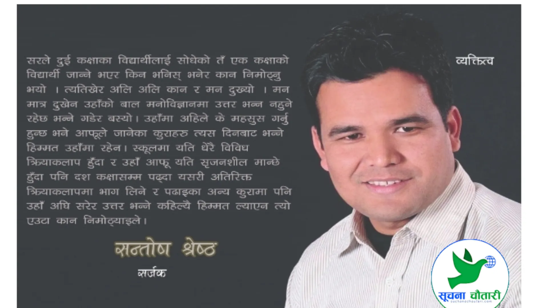 स्कूलमा यति धेरै विविध क्रियाकलाप हुँदा र उहाँ आफू यति सृजनशील मान्छे हुँदा पनि दश कक्षासम्म पढ्दा यसरी अतिरिक्त क्रियाकलापमा भाग लिने र पढाइका अन्य कुरामा पनि उहाँ अघि सरेर उत्तर भन्ने कहिल्यै हिम्मत ल्याएन त्यो एउटा कान निमोठ्याइले । उहाँ एक प्रकारले भन्नुपर्दा दश कक्षासम्म पढ्दा गुम्सिएर बस्न बाध्य हुनुभयो । आईए पढ्न दाङ गएपछि मात्र अतिरिक्त क्रियाकलापमा भाग लिने र अघि बढाउने प्रयास गर्नु भएको हो ।