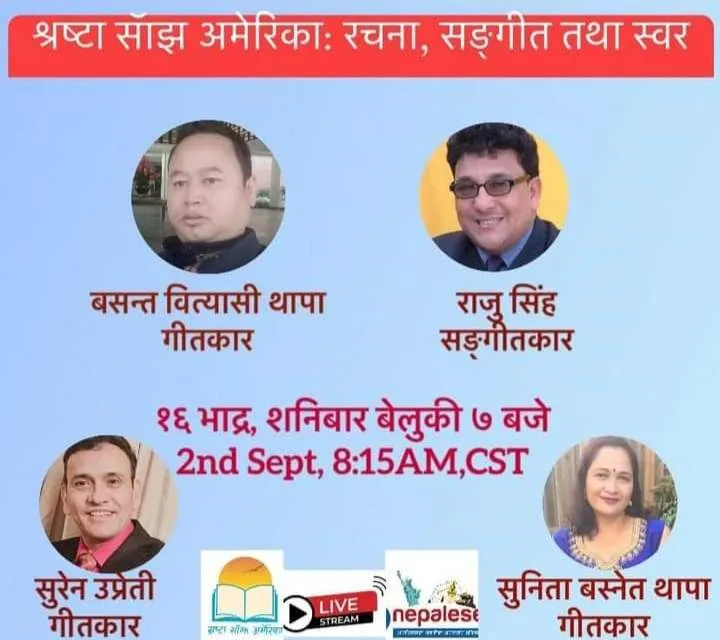 नेपालका चर्तित कलाकार द्धोय गीतकार बसन्त वित्यासी थापा तथा संगितकार राजु शिंह को वेजोड सांगीतिक तथा रचना वाचन कार्यक्रम जुम भर्चुअल प्रविधि मार्फत यहि भदौ १६ गते शनिवार अमेरिकामा सु सम्पन्न भएको छ।
