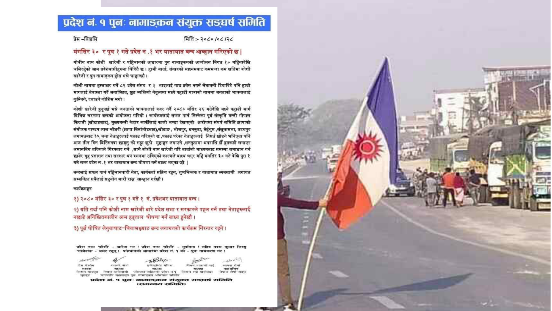 संयुक्त संघर्ष समितिले प्रेस बिज्ञप्ति जारी गर्दै भाेलि मंसिर ३० र पौष १ गते प्रदेश १ सबै यातायात बन्द गर्ने घोषणा गरेको छ । बिज्ञप्तिमा कोशी नाम खारेजी हुनुपर्छ भन्ने जनताको भावनालाई कदर गर्दै २०८० मंसिर २६ गतेदेखि मध्य पहाडी मार्गमा बिभिन्न चरणकाे बन्दको आयोजना गरिएको जनाएको छ । कार्यक्रमलाई सफल पार्न निस्केका पूर्ब संस्कृति मन्त्री गोपाल किरातीलाई खोटाङबाट पक्राउगरिइकाे छ भने , मुख्यमन्त्री केदार कार्कीलाई कालो भण्डा देखाएको आरोपमा संघर्ष समिति झापाको संयोजक पाण्डप लाल चौधरीलाई झापाकाे बिर्तामोडबाट पक्राउ गरेकाे छ।