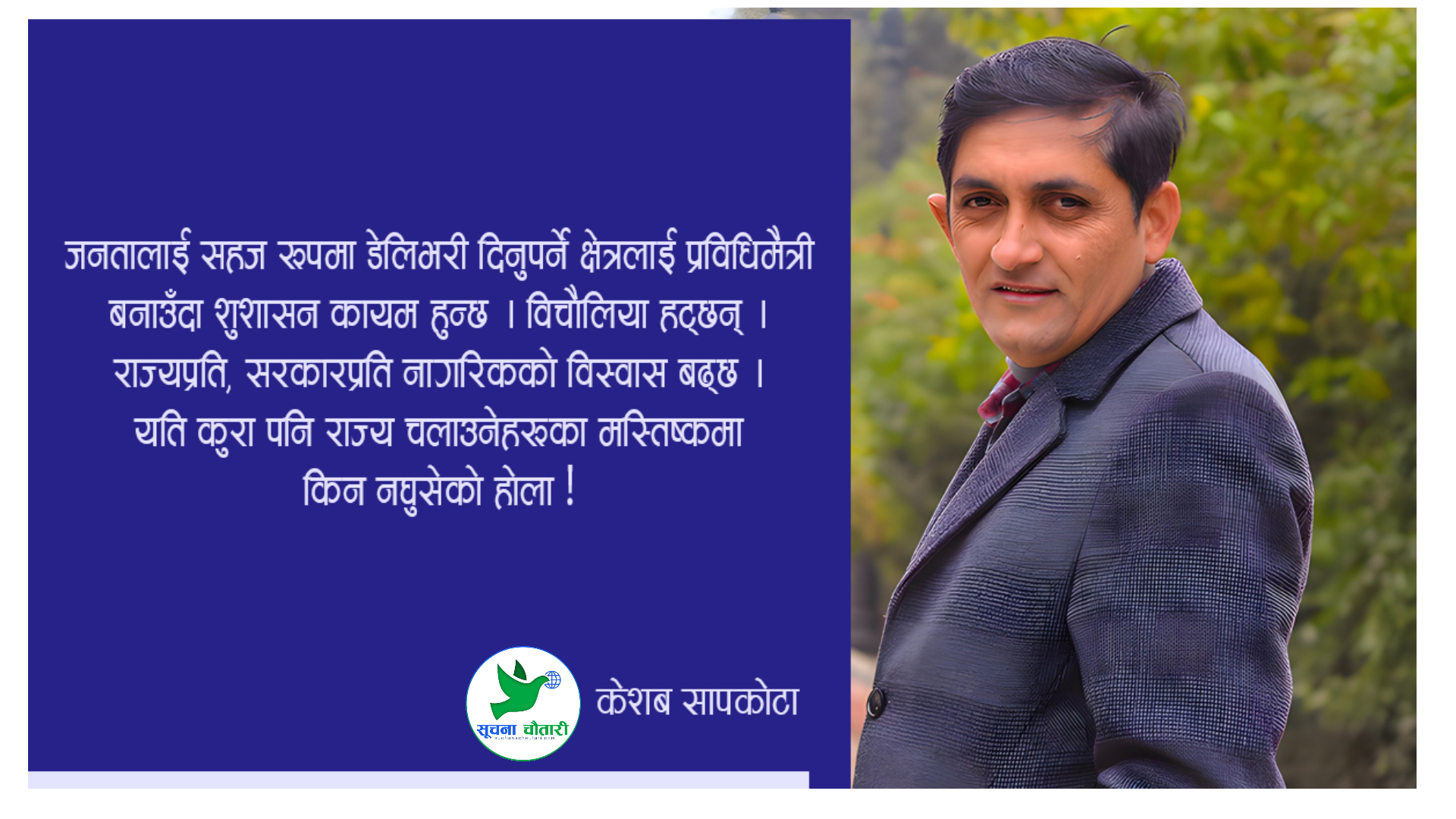 जनतालाई सहज रूपमा डेलिभरी दिने क्षेत्रलाई प्रविधिमैत्री बनाउँदा शुशासन कायम हुन्छ । विचाैलिया हट्छन् । राज्यप्रति, सरकारप्रति नागरिककाे विस्वास बढ्छ । यति कुरा पनि राज्य चलाउनेहरूका मस्तिष्कमा किन नघुसेकाे हाेला ! याे चेत यातायात व्यवस्था कार्यालयमा मात्र हैन राज्यका हरेक निकायमा कहिले पुग्ला !
