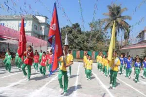 सोमबार विद्यालय परिसरमा मार्चपास गर्दै सञ्चालन भएकोे खेलकुद सप्ताहको एन् प्याब्सनका मोरङका अध्यक्ष नारायण ढकालले उद्घाटन गरेका थिए ।