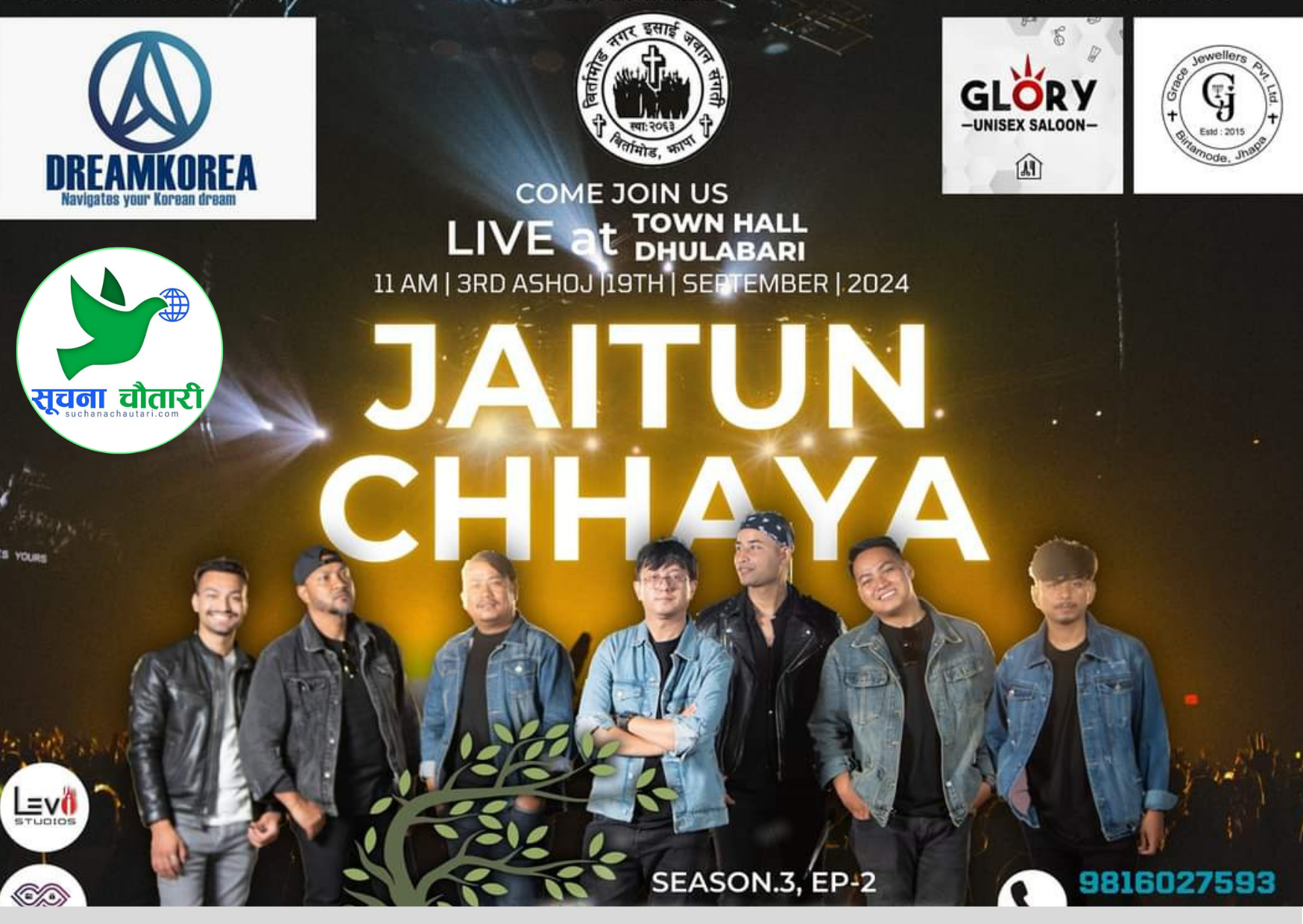 डिकेन्द्र बस्नेत, झापा । विर्तामोड नगर ईसाई समाज जवान संगतीको आयोजनामा जैतून छाँया कन्सर्ट विर्तामोडमा रहेको कृष्ण हलमा हुने भनिए पनि विविध कारणवश धुलाबारी टाउन हलमा हुने आयोजक टिमले जनाएको छ।