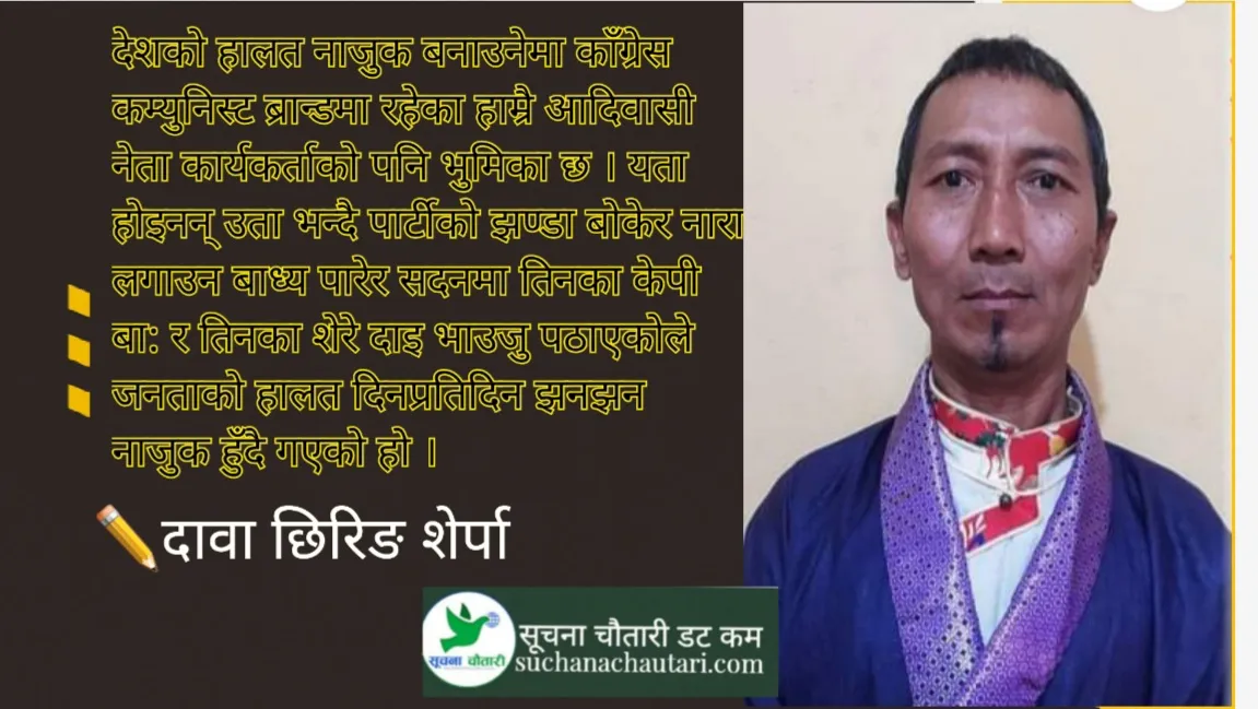 दावा छिरिङ शेर्पा 🖊️ हामी यतातिर थोरै समय दिएर पढौं, समयको खेल हो के थाहा भाेली तपाईंको काँधमा पनि जिम्मेवारी थपिन सक्छ । हामी देश परिवर्तन हुने भरोसामा धेरै दलहरुलाई भोट दिएर सदनमा पठायौं, तर कसैले आम नेपाली जनताको लागि कुनै सुबिधाजन्य सेवा प्रवाहित गर्न र गराउन सकेको छैनन् सकिदैन पनि किन भने हामीले चुनेको ब्याक्ति पनि त्यस्तै खराब भएरै हाम्रो उत्साह निराशामा परिणत भएको हो ।
