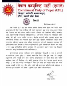 सोमबार एमाले मकवानपुरका अध्यक्ष श्रीधर पोखरेलले विज्ञप्ती जारी गरी असोज ११ र १२ गतेको वर्षाको कारण मुलुकभर भएको जनधनको क्षती प्रति दुःख व्यक्त गर्दै सम्पूर्ण कार्यक्रमहरु स्थगीत गरेको जानकारी दिए ।