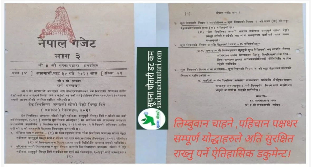 किनकि यसमा २०२१ साल भाद्र ३० गते तत्कालिन शाशक महेन्द्रको जगजगी भएको बेला ,कसैले पनि महेन्द्रलाई ठाडो नजरले हेर्न नसकेको बेला , उक्त स्व –घोषित चक्रवती शाशक महेन्द्रले पनि पल्लो किरात लिम्बुवानको ‘’लिम्बु किपट भुमि ‘’ हरु नचलाउनु भन्ने आदेश राजपत्र मा बुदा न .४ मा प्रिन्ट भएर आएको छ ।