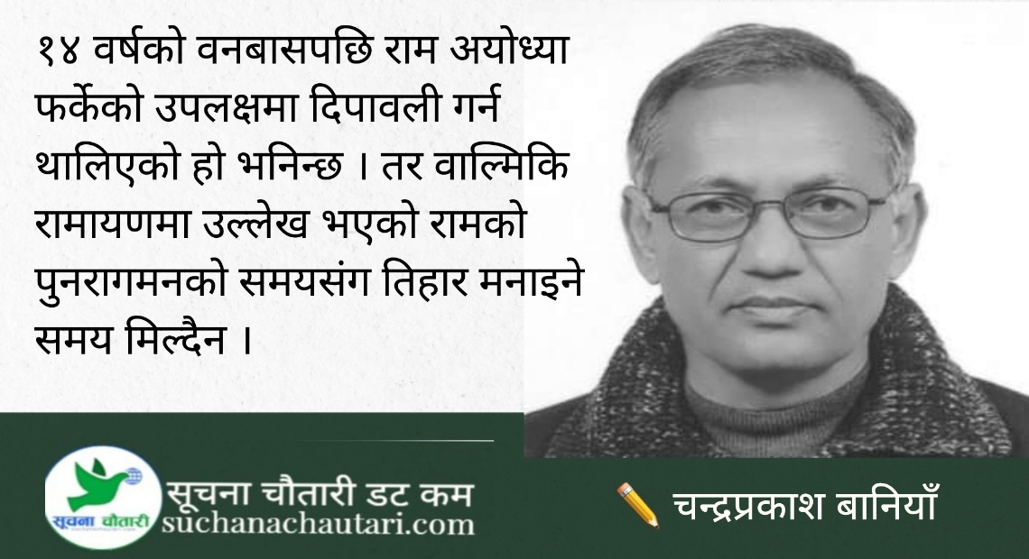 १). १४ वर्षको वनबासपछि राम अयोध्या फर्केको उपलक्षमा दिपावली गर्न थालिएको हो भनिन्छ । तर वाल्मिकि रामायणमा उल्लेख भएको रामको पुनरागमनको समयसंग तिहार मनाइने समय मिल्दैन ।