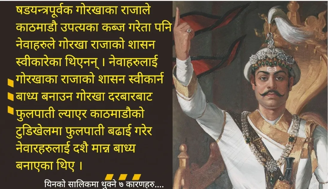 ४, नेवा : षडयन्त्रपूर्वक गोरखाका राजाले काठमाडौ उपत्यका कब्ज गरेता पनि नेवारहरुले गोरखा राजाको शासन स्वीकारेका थिएनन् । नेवारहरुलाई गोरखा राजाको शासन स्वीकार्न बाध्य बनाउन गोरखा दरबारबाट फुलपाती ल्याएर काठमाडौको टुडिखेलमा फुलपाती बढाई गरेर नेवारहरुलाई दशै मान्न बाध्य बनाएका थिए ।