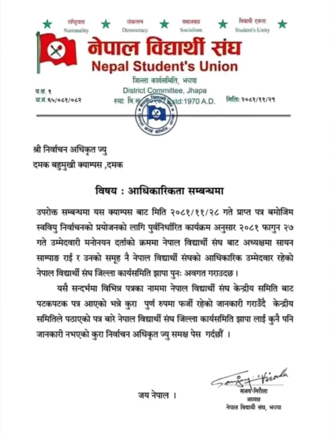 यसैगरि, आजनै नेविसंघ झापाले दमक बहुमुखी क्याम्पसमा स्ववियू सभापतिका उम्मेदवार सायन राई नै आधिकारिक भएको बताएको छ । संघका जिल्ला अध्यक्ष सञ्जय निरौलाले स्ववियू सभापतिमा राईनै आधिकारिक उम्मेदवार भएको र केन्द्रीय समितिको फर्जी पत्र सार्वजनिक गरेर संघलाई कमजोर बनाउने कार्य कदापि स्वीकार्य नहुने उल्लेख गरेका छन् ।