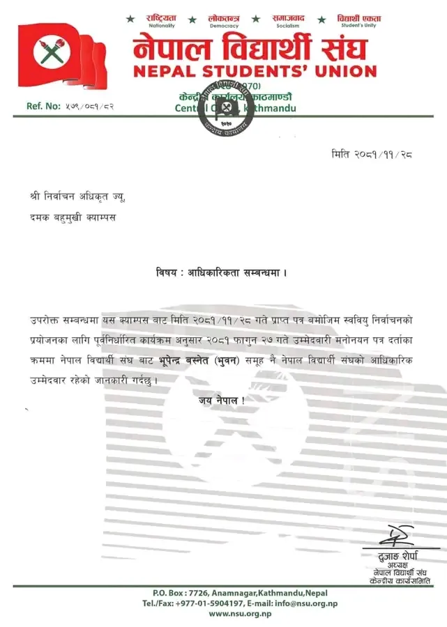 नेबिसंघ केन्द्रले आधिकारिक उम्मेदवार भुवन बस्नेत(भुपेन्द्र)हो भनिरहेको छ भने जिल्ला समिती झापा र क्याम्पस कमिटीले भने सयन सामपाङलाइ आधिकारिक हो भनी रहेको छ।