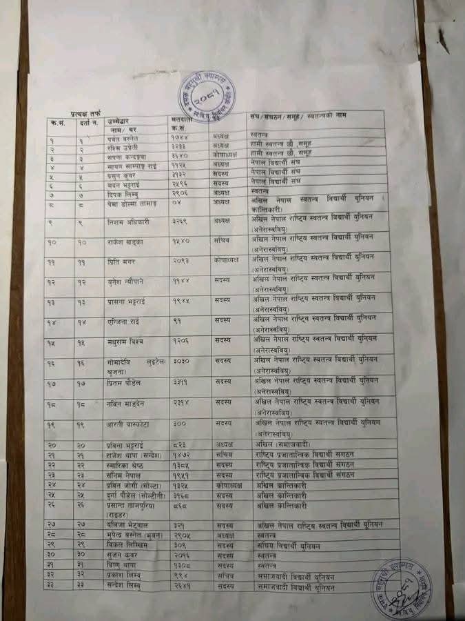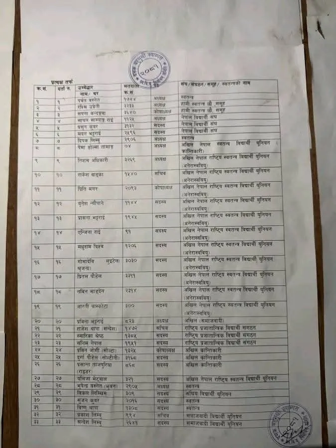उम्मेदवारी दर्ता प्रक्रियामा भुवन बस्नेत(भुपेन्द्र) स्वतन्त्र भनेर स्वबियु निर्वाचनले नाम निकालेको छ भने नेबिसंघको उम्मेदवार भनेर सयन सामपाङ्लाइ भनिएको छ।