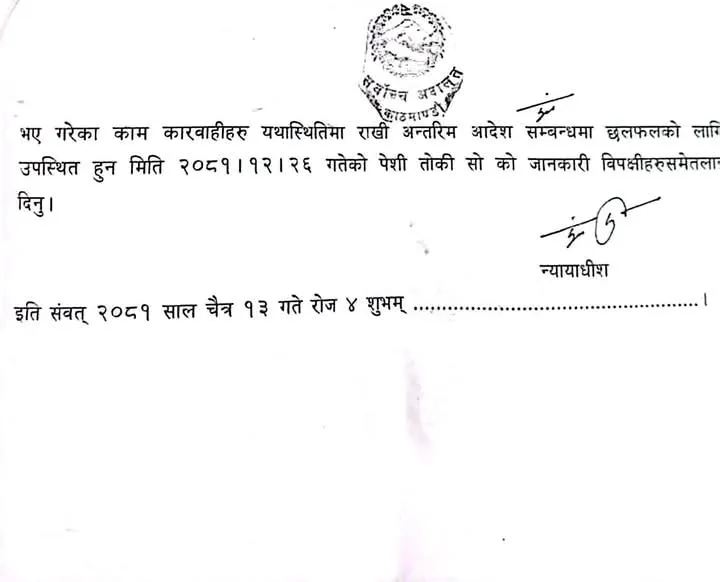 गत बुधबार न्यायाधीश शारंगा सुवेदीको इजलासले अन्तरिम आदेश जारी गर्ने वा नगर्ने भन्नेबारे छलफल गर्न २६ चैतमा दुवै पक्षलाई झिकाएको छ ।