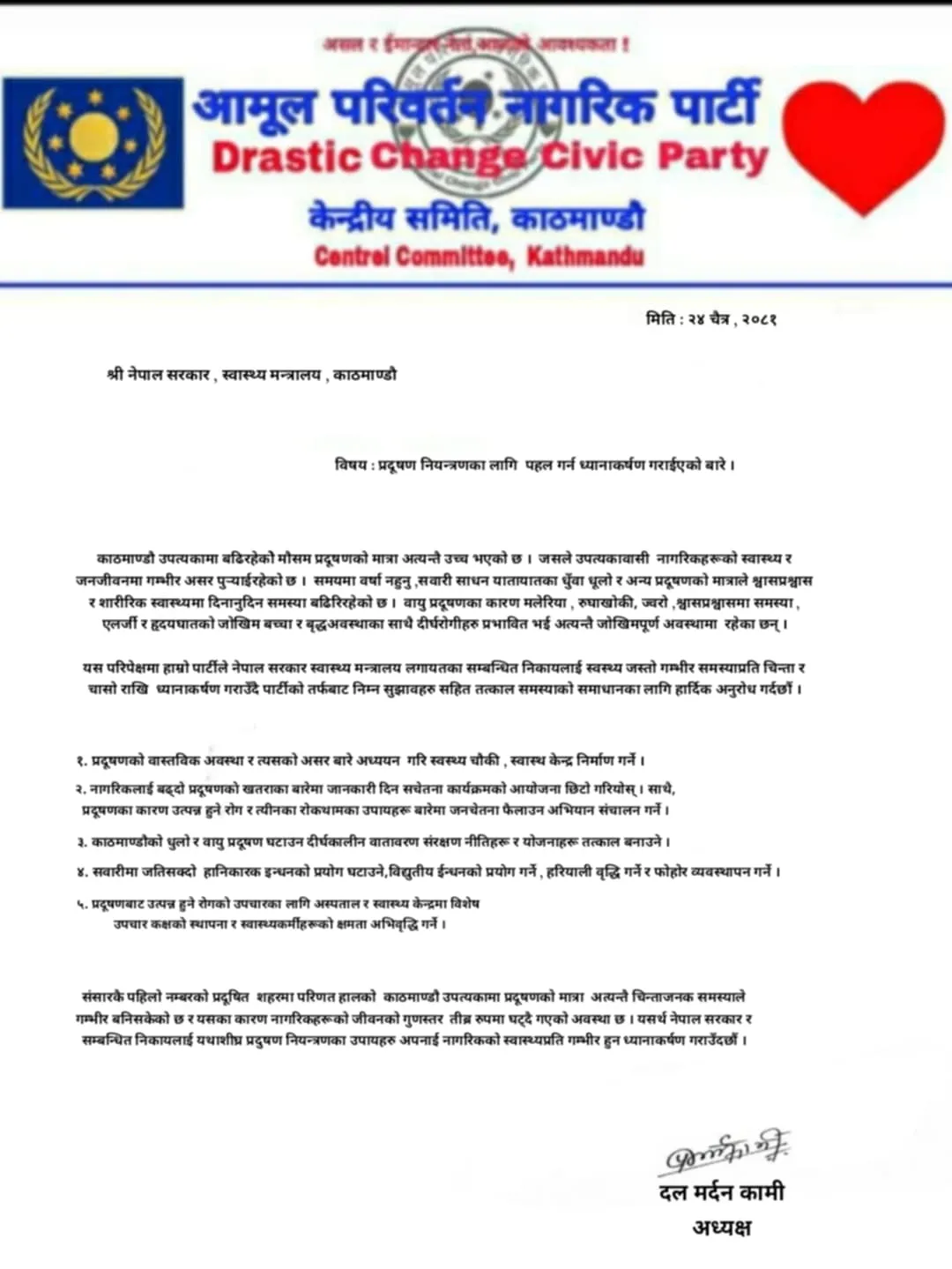 बिज्ञाप्तीमा संसारकै पहिलो नम्बर प्रदुषण शहरमा परिणत हालको काठमाण्डौ उपत्यकामा प्रदूषणकाे मात्रा अत्यन्तै चिन्ताजनक समस्याले गम्भीर बनिसकेको छ र यसका कारण नागरिकहरूको जीवनको गुणस्तर लतीब्र रुपमा घट्दै गएको अवस्था छ । यसर्थ नेपाल सरकार र सम्बन्धित निकायलाई यथाशीघ्र प्रदुषण नियन्त्रणका उपायहरु अपनाई नागरिकको स्वास्थ्यप्रति गम्भीर हुन ध्यानाकर्षण गराएको उल्लेख गरेका छन।