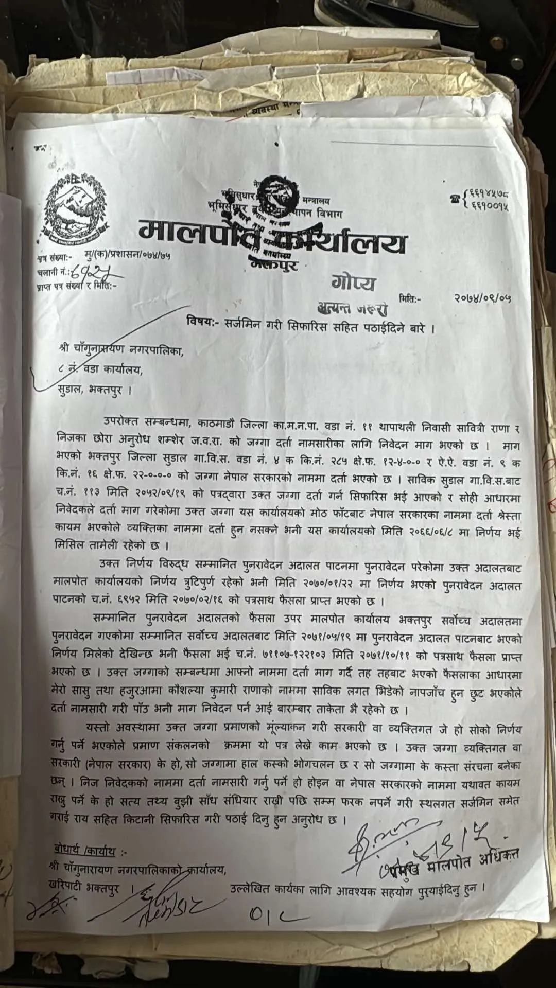 २०७८ साल जेष्ठ १३ गत्ते नेपाल सरकारकाे मन्त्री परिषद्ले निर्णयगरि शहिद धर्मभक्त राष्ट्रिय प्रत्याराेपण केन्द्रकाे नाममा प्राप्त भएकाे चागुनारायण नगरपालिका वडानम्बर ३ झाैखेलकाे जग्गामा बनाउन प्रयत्न नगरि आलटाल गरेर ८ नम्बर वडा सुडालकाे बिबादित जग्गामा बनाउनु खाेज्नु नगरपालिका र नगर प्रमुखकाे के स्वर्थ छ?