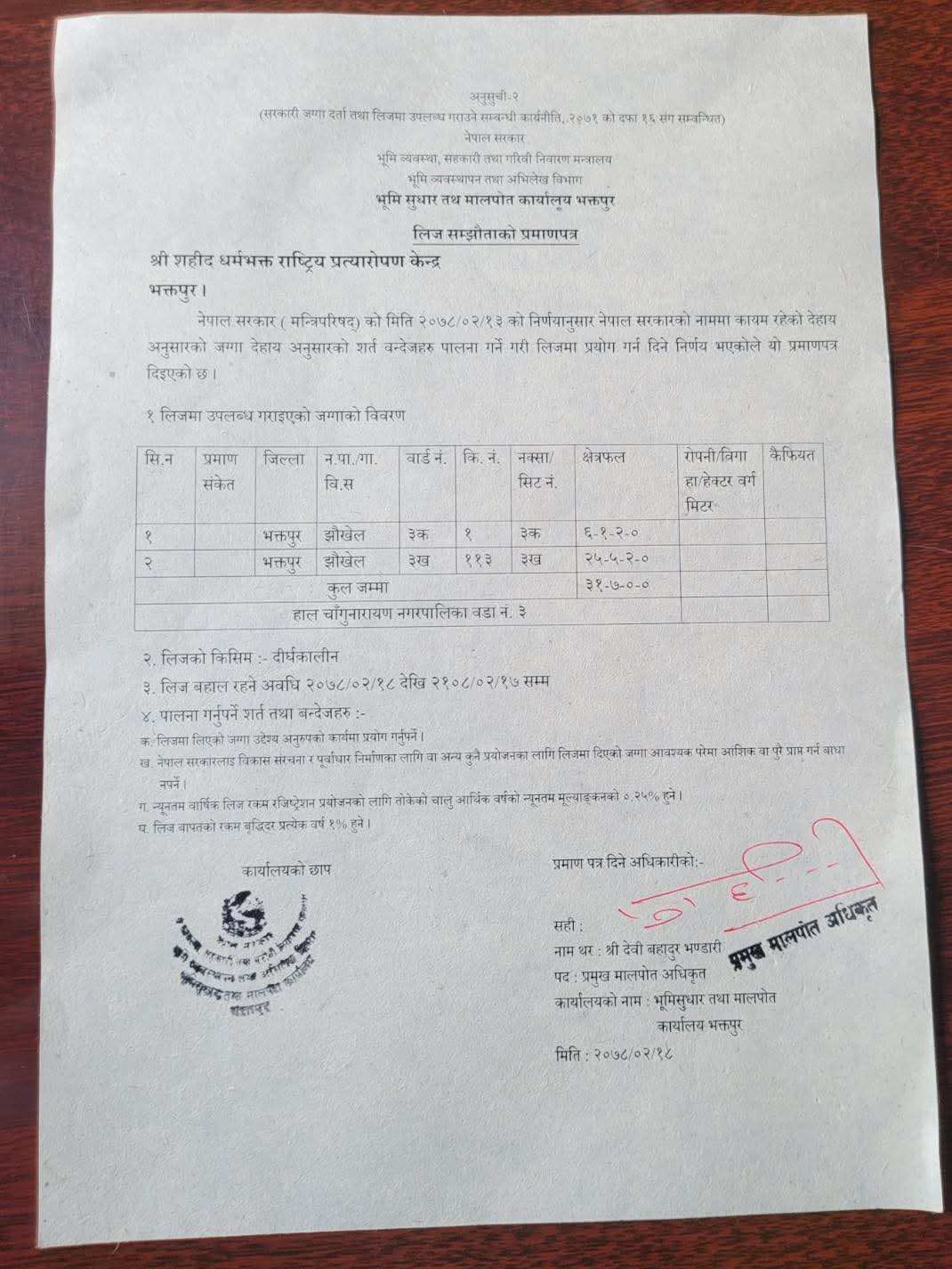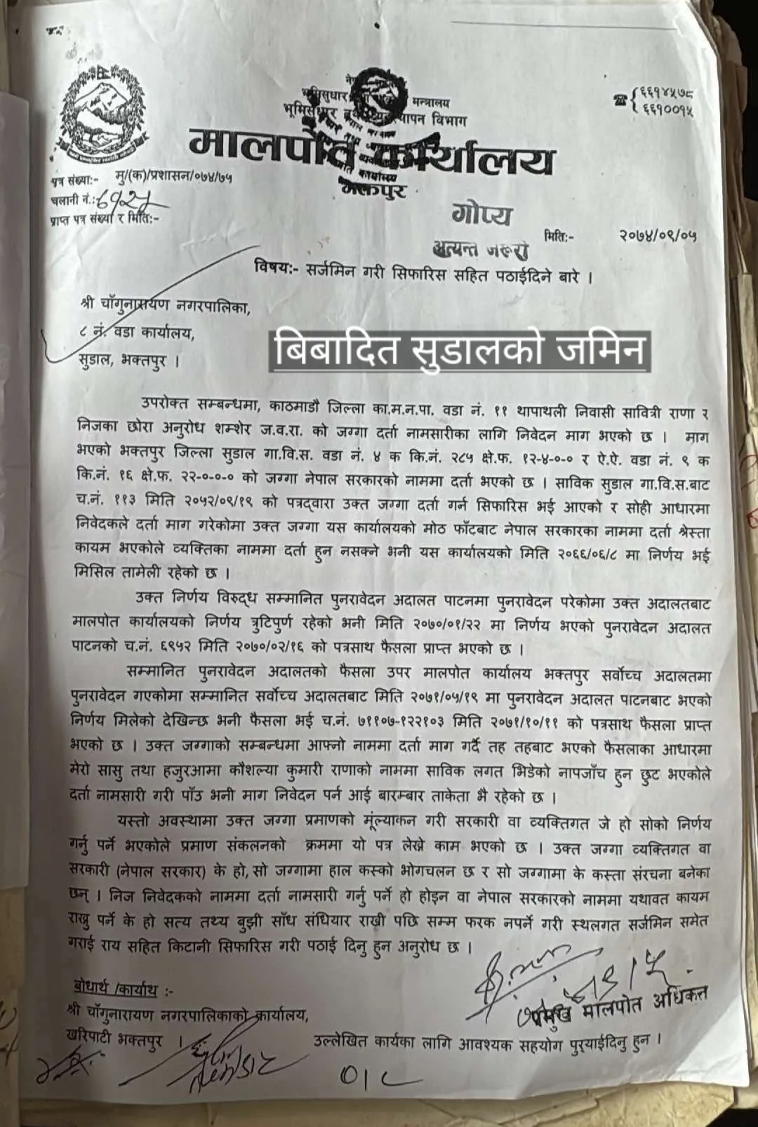 २०७८ साल जेष्ठ १३ गत्ते नेपाल सरकारकाे मन्त्री परिषद्ले निर्णयगरि शहिद धर्मभक्त राष्ट्रिय प्रत्याराेपण केन्द्रकाे नाममा प्राप्त भएकाे चागुनारायण नगरपालिका वडानम्बर ३ झाैखेलकाे जग्गामा बनाउन प्रयत्न नगरि आलटाल गरेर ८ नम्बर वडा सुडालकाे बिबादित जग्गामा बनाउनु खाेज्नु नगरपालिका र नगर प्रमुखकाे के स्वर्थ छ?
