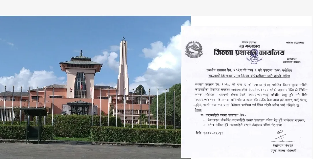 शुक्रबार काठमाडौँका प्रमुख जिल्ला अधिकारी ऋषिराम तिवारीले उक्त स्थानमा पाँच जनाभन्दा बढि व्यक्ति भेला भई अनसन, धर्ना, घेराउ, जुलुस, प्रदर्शन तथा सभा जस्ता विरोधका कार्यक्रम गर्न निषेध गरेको आदेश जारी गरेका हुन् ।