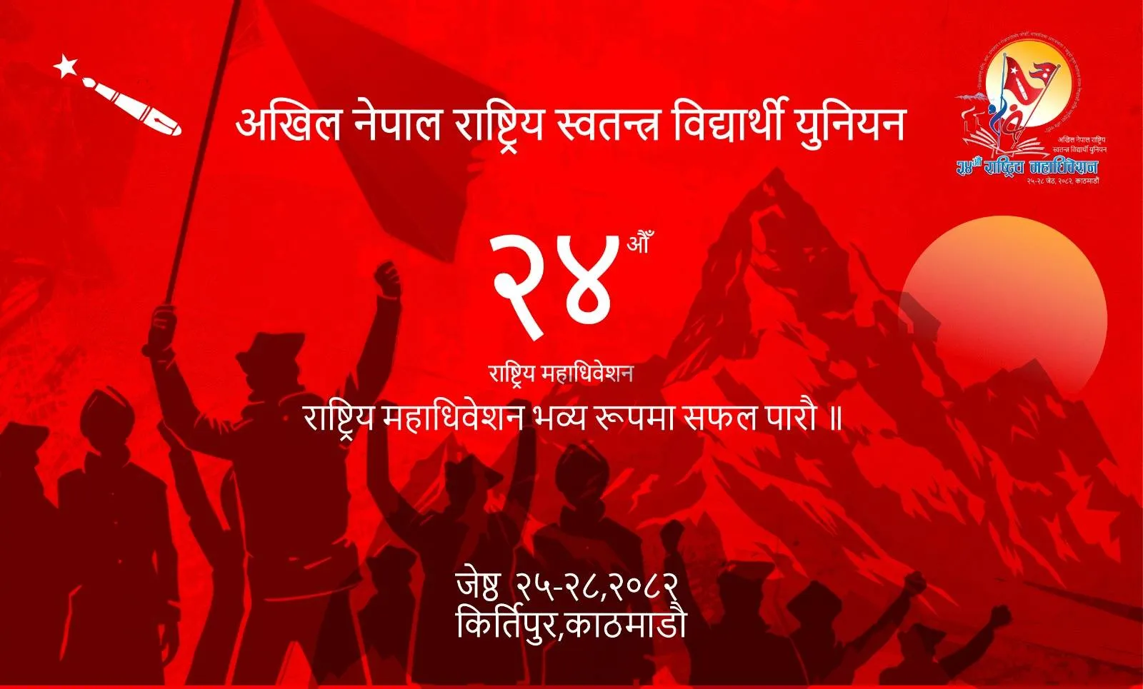 काठमाडौँ । नेकपा एमालेको विद्यार्थी सङ्गठन अनेरास्ववियुको २४ औं राष्ट्रिय महाधिवेशन आजदेखि सुरु हुन लागेको छ । कीर्तिपुरस्थित त्रिभुवन विश्वविद्यालयमा हुने महाधिवेशनको उद्घाटन प्रधानमन्त्री तथा एमाले अध्यक्ष केपी शर्मा ओलीले गर्नेछन् ।