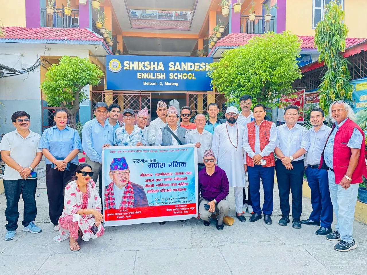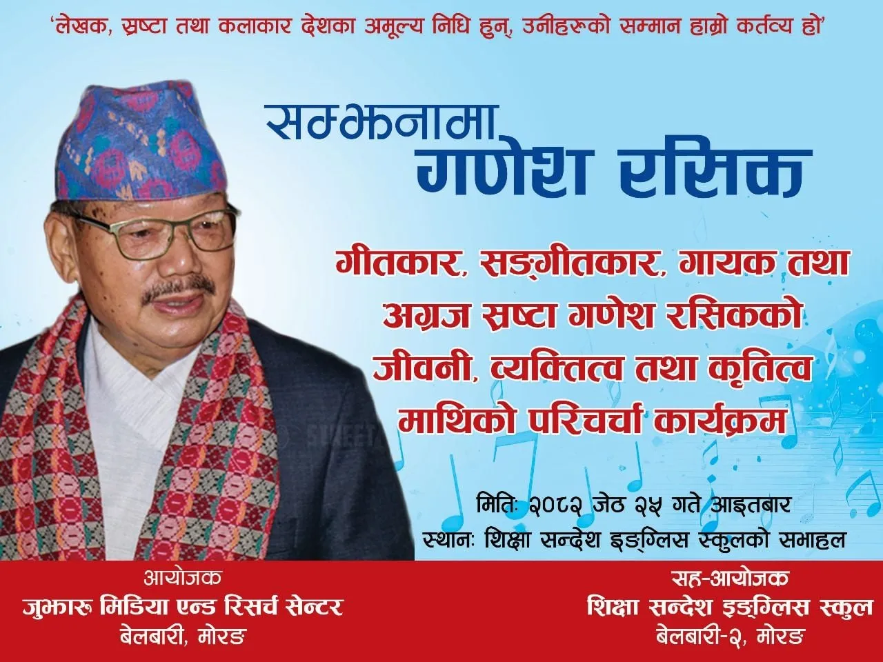 हिमांशु राय , बेलबारी-मोरङ । मोरङको बेलबारीमा ‘सम्झनामा गणेश रसिक’ कार्यक्रम सम्पन्न भएको छ।लेखक तथा स्रष्टाहरु कहिल्यै मर्दैनन् भन्ने सन्देश प्रवाह गर्न दिवङ्गत गीतकार, सङ्गीतकार, गायक तथा अग्रज स्रष्टा गणेश रसिकको जीवनी, व्यक्तित्व तथा कृतित्वमाथिको चर्चा गरेर उक्त कार्यक्रम सम्पन्न गरिएको थियो।