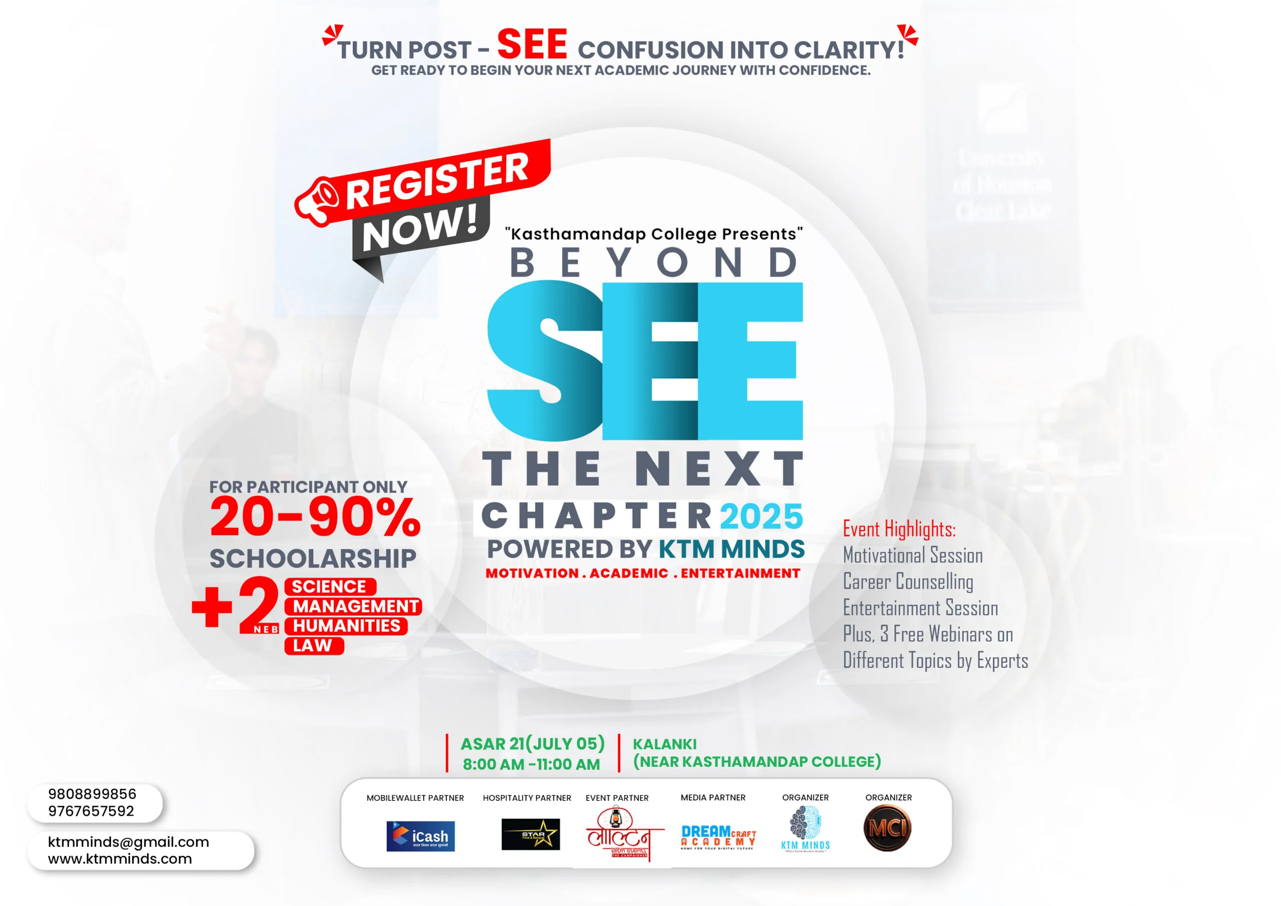 यही आवश्यकता बुझ्दै, काष्ठमण्डप कलेज र KTM Minds को संयुक्त पहलमा ‘Beyond SEE: The Next Chapter 2025’ नामक एक विशेष निःशुल्क उत्प्रेरणात्मक कार्यक्रम असार २१ गते शनिबार काठमाडौंको कालंकी क्षेत्रमा आयोजना हुँदैछ।