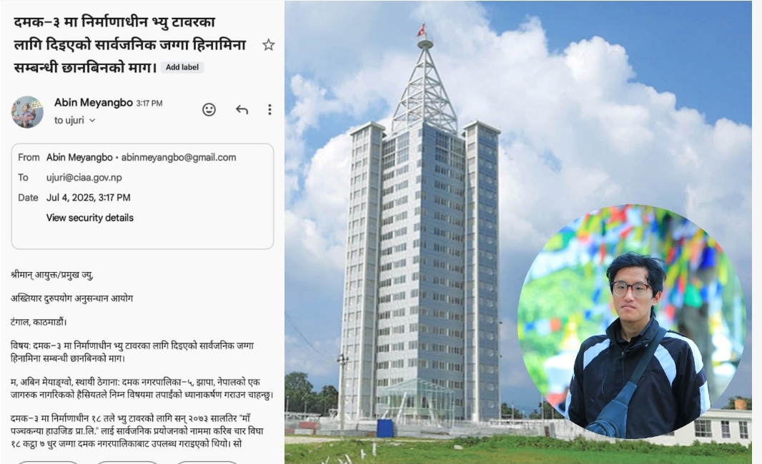 विषय: दमक–३ मा निर्माणाधीन भ्यु टावरका लागि दिइएको सार्वजनिक जग्गा हिनामिना सम्बन्धी छानबिनको माग।
