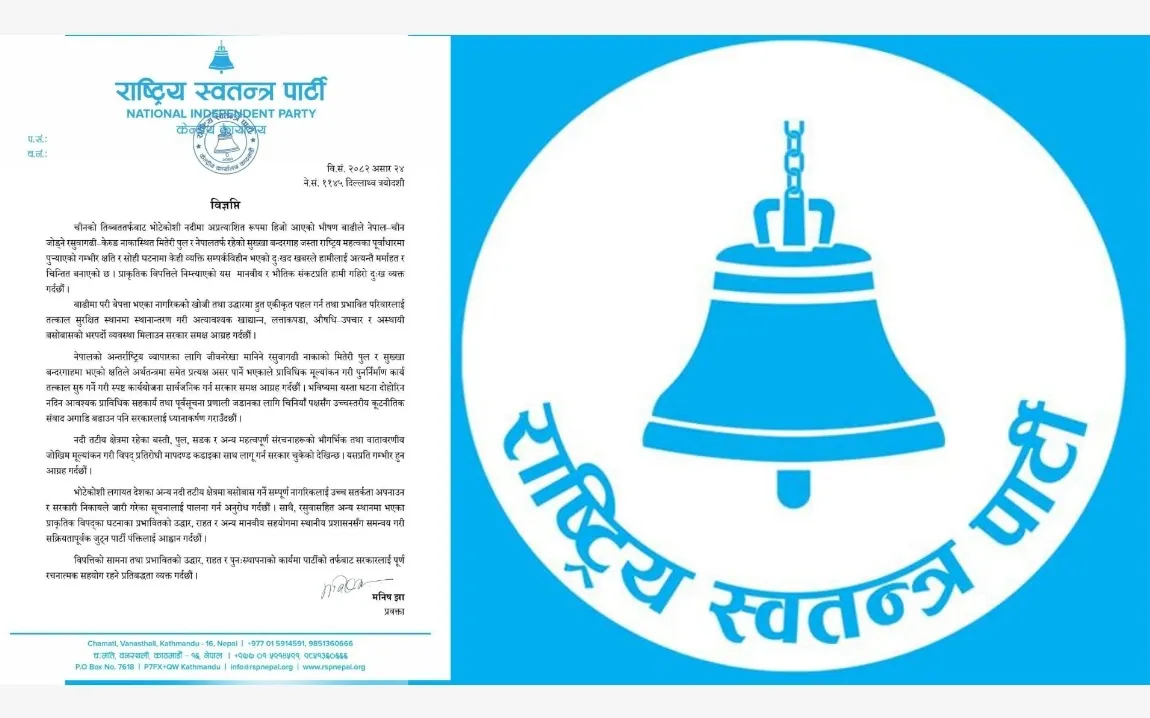 काठमाडौं । चीनको तिब्बततर्फबाट भोटेकोशी नदीमा अप्रत्याशित रूपमा हिजो आएको भीषण बाढीले नेपाल–चीन जोड्ने रसुवागढी–केरुङ नाकास्थित मितेरी पुल र नेपालतर्फ रहेको सुख्खा बन्दरगाह जस्ता राष्ट्रिय महत्वका पूर्वाधारमा पुर्याएको गम्भीर क्षति र सोही घटनामा केही व्यक्ति सम्पर्कविहीन भएको प्रति रास्वपाले दुख ब्यक्त गरेकाे छ।
