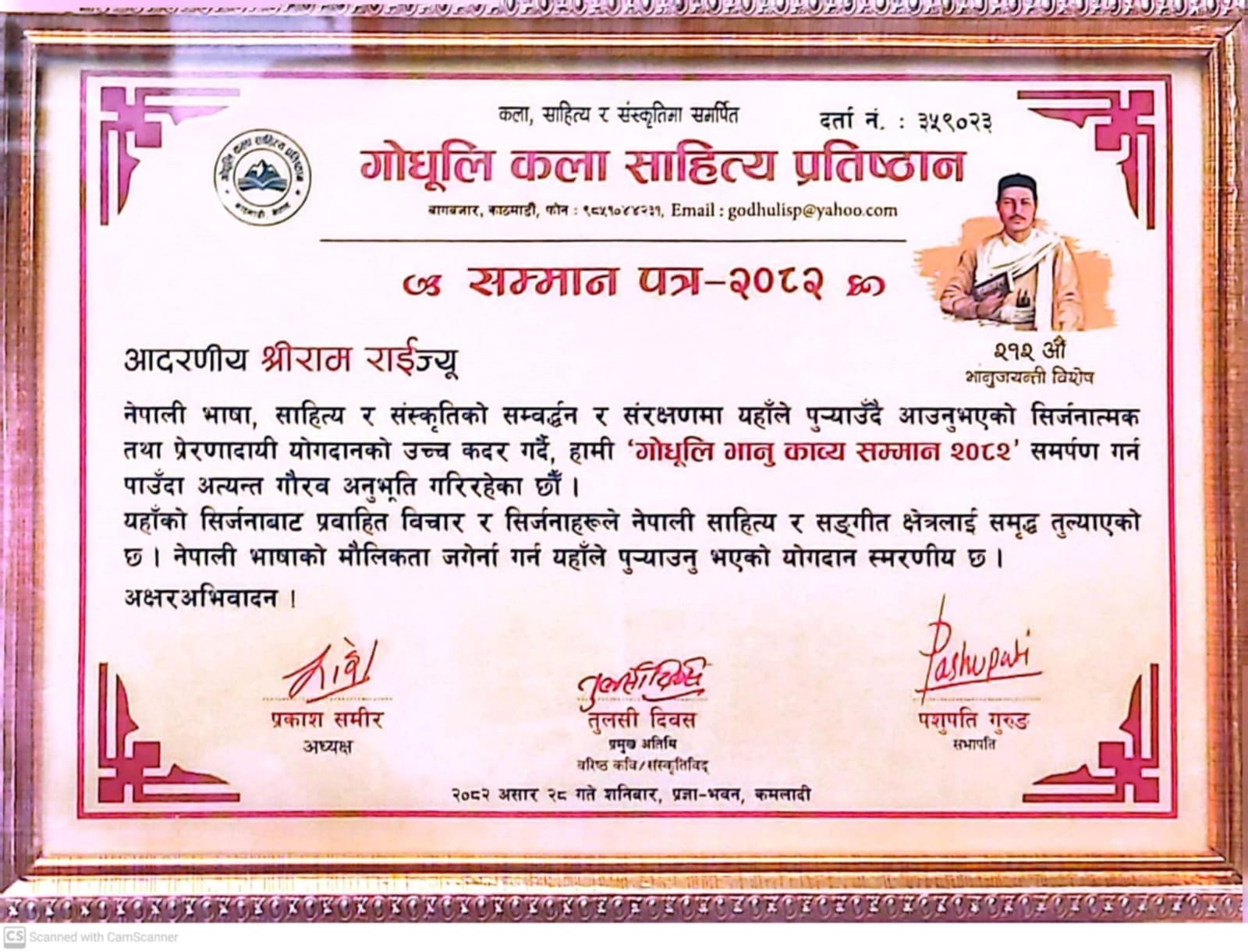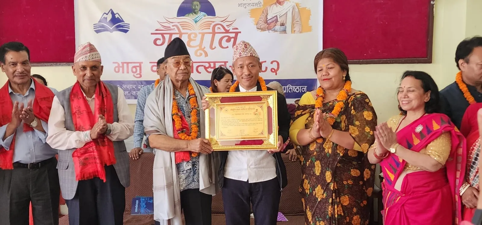 काठमाडाैँ । गोधूलि कला, साहित्य प्रतिष्ठानले खोटाङका साहित्यकार एवं सञ्चारकर्मी श्रीराम राईलाई ‘गोधूलि भानु काव्य सम्मान–२०८२’ प्रदान गरिएको छ । २१२ औं भानुजयन्तीको अवसरमा नेपाल प्रज्ञाप्रतिष्ठानमा आयोजित कार्यक्रममा प्रतिष्ठानले साहित्यकार एवं सञ्चारकर्मी राईलाई नेपाली भाषा, साहित्य र संस्कृतिको सम्वर्द्धन र संरक्षणमा पुर्याएको योगदानको कदर गर्दै ‘गोधूलि भानु काव्य सम्मान’ प्रदान गरेको हो ।