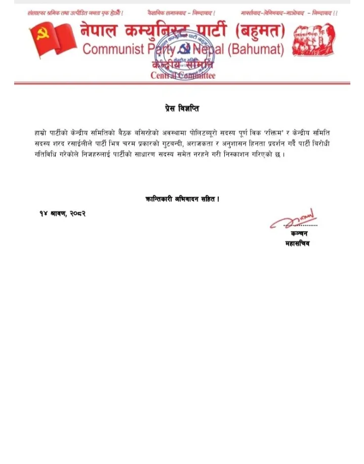 पार्टी महासचिव धर्मेन्द्र बास्तोला ‘कञ्चन’ले विज्ञप्ति जारी गर्दै विक र रसाइलीले पार्टीभित्र चरम प्रकारको गुटबन्दी, अराजकता र अनुशासनहीनता प्रदर्शन गरेकाले पार्टीको साधारण सदस्य समेत नरहने गरी निस्कासन गरिएको बताएका छन्।