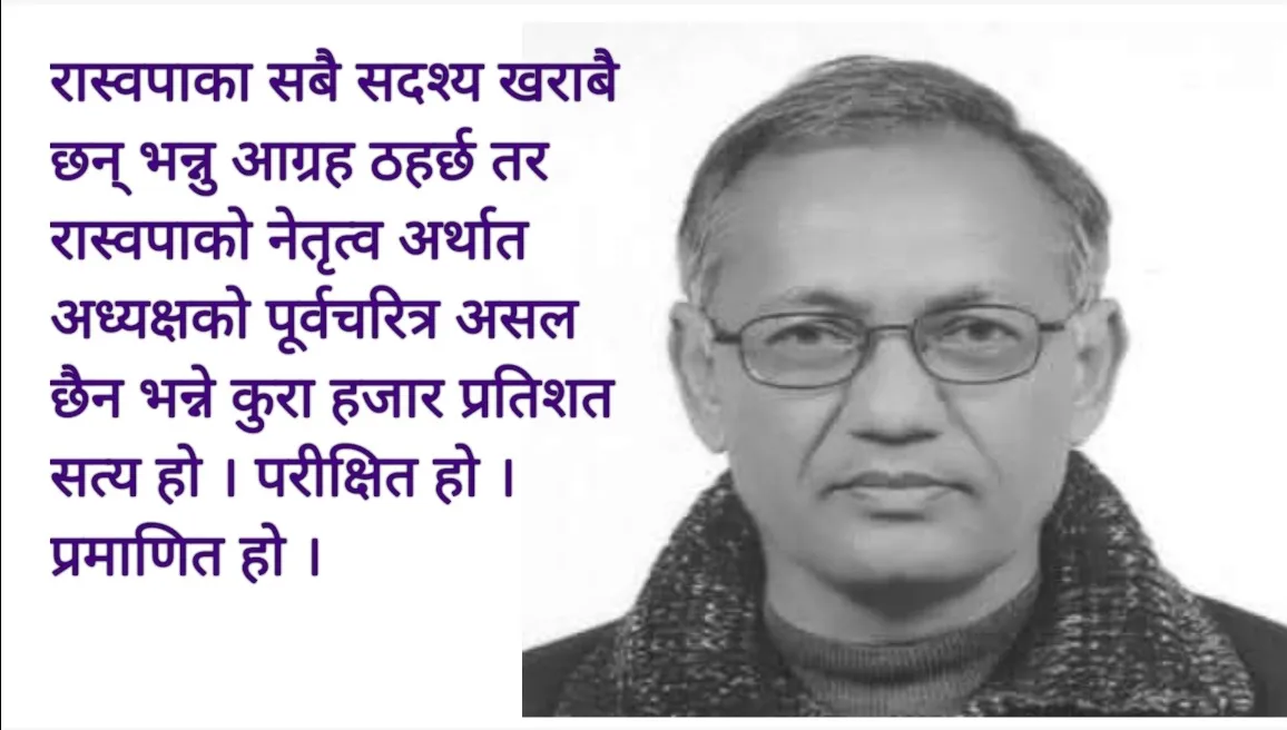 रास्वपाका सबै सदश्य खराबै छन् भन्नु आग्रह ठहर्छ तर रास्वपाको नेतृत्व अर्थात अध्यक्षको पूर्वचरित्र असल छैन भन्ने कुरा हजार प्रतिशत सत्य हो । परीक्षित हो । प्रमाणित हो ।