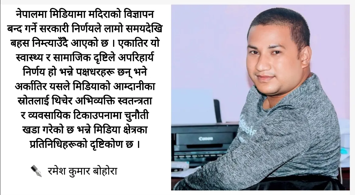 ✒️ रमेश कुमार बोहोरा , नेपालमा मिडियामा मदिराको विज्ञापन बन्द गर्ने सरकारी निर्णयले लामो समयदेखि बहस निम्त्याउँदै आएको छ । एकातिर यो स्वास्थ्य र सामाजिक दृष्टिले अपरिहार्य निर्णय हो भन्ने पक्षधरहरू छन् भने अर्कातिर यसले मिडियाको आम्दानीका स्रोतलाई थिचेर अभिव्यक्ति स्वतन्त्रता र व्यवसायिक टिकाउपनामा चुनौती खडा गरेको छ भन्ने मिडिया क्षेत्रका प्रतिनिधिहरूको दृष्टिकोण छ । खासगरी विज्ञापनमा निर्भर हुने निजी सञ्चार माध्यमहरूको दृष्टिकोणले यो विषयलाई गम्भीर ढंगले बुझ्नु जरुरी छ । नेपालमा सञ्चार माध्यमहरू प्रायः विज्ञापनबाट चल्ने भएकाले यस्तो निषेधले उनीहरूको अस्तित्व र दिगोपनामा प्रत्यक्ष प्रहार गरेको छ भन्ने तथ्यलाई बेवास्ता गर्न सकिँदैन ।