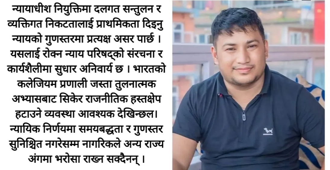 अर्को बहस न्यायपालिकाको स्वतन्त्रतासँग सम्बन्धित छ । संविधानले न्यायपालिकालाई लोकतान्त्रिक शासनको मेरुदण्डका रूपमा मान्यता दिएको भए पनि पछिल्ला वर्षहरूमा न्यायपालिका नै सर्वाधिक आलोचनाको केन्द्र बनेको छ । विवादास्पद फैसला, ढिलो न्याय र राजनीतिक प्रभावमा नियुक्त भएका न्यायाधीशहरूको कार्यशैलीले न्यायपालिकाको विश्वसनीयता कमजोर बनाएको छ । न्यायाधीश नियुक्तिमा दलगत सन्तुलन र व्यक्तिगत निकटतालाई प्राथमिकता दिइनु न्यायको गुणस्तरमा प्रत्यक्ष असर पार्छ । यसलाई रोक्न न्याय परिषद्को संरचना र कार्यशैलीमा सुधार अनिवार्य छ । भारतको कलेजियम प्रणाली जस्ता तुलनात्मक अभ्यासबाट सिकेर राजनीतिक हस्तक्षेप हटाउने व्यवस्था आवश्यक देखिन्छल। न्यायिक निर्णयमा समयबद्धता र गुणस्तर सुनिश्चित नगरेसम्म नागरिकले अन्य राज्य अंगमा भरोसा राख्न सक्दैनन् ।