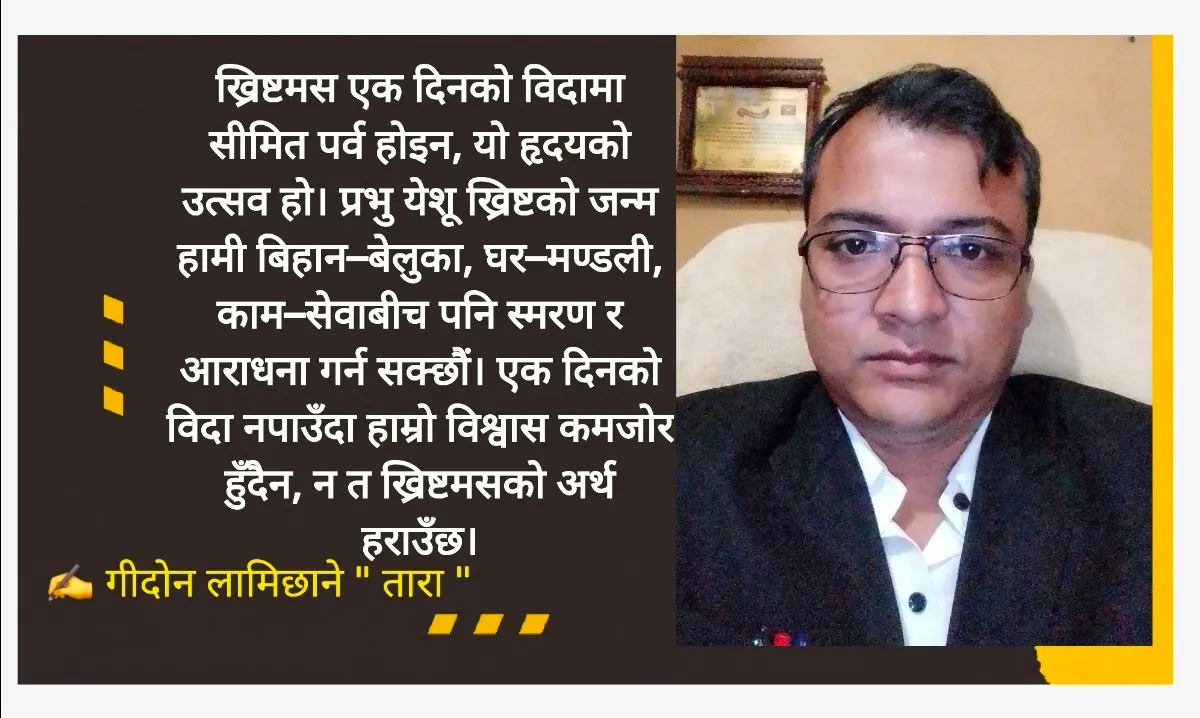 ✍️गीदाेन लामिछााने ( तारा ), आज हाम्रो देश गम्भीर आर्थिक, सामाजिक र राजनीतिक संकटतर्फ अघि बढिरहेको छ। यस्तो संवेदनशील घडीमा डिसेम्बर २५ मा ख्रिष्टमसको सार्वजनिक विदा नपरेको विषयलाई लिएर इसाई समुदायभित्र अत्यधिक रोईलो र आक्रोश देखिनु दुखद मात्र होइन, हाम्रो मसीही साक्षीका लागि पनि चुनौतीपूर्ण छ।
