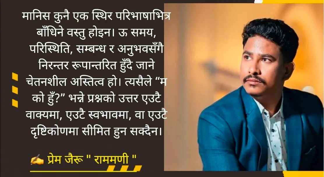 मानिस कुनै एक स्थिर परिभाषाभित्र बाँधिने वस्तु होइन। ऊ समय, परिस्थिति, सम्बन्ध र अनुभवसँगै निरन्तर रूपान्तरित हुँदै जाने चेतनशील अस्तित्व हो। त्यसैले “म को हुँ?” भन्ने प्रश्नको उत्तर एउटै वाक्यमा, एउटै स्वभावमा, वा एउटै दृष्टिकोणमा सीमित हुन सक्दैन।