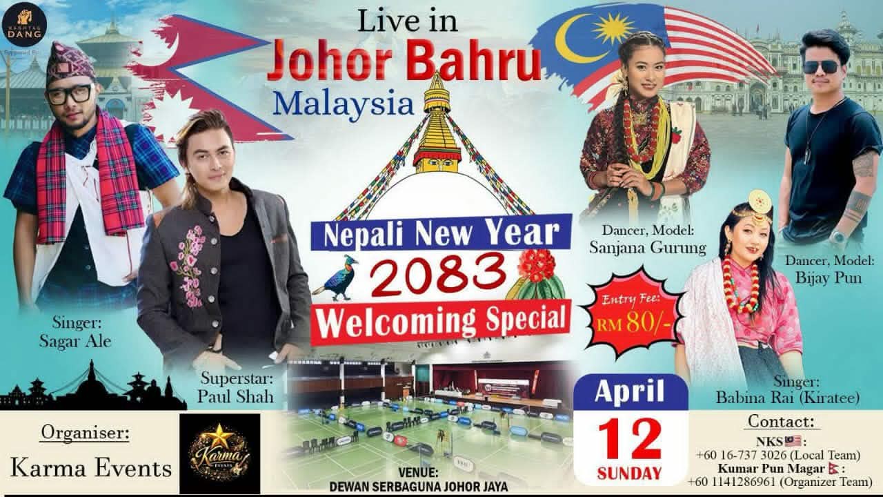 सुमन विश्वकर्मा मलेसिया । कर्मा इभेन्ट्सको आयोजनामा जोहोर बारुमा नेपाली नयाँ वर्ष २०८३ लाई स्वागत गर्न भव्य सांगीतिक कार्यक्रम आयोजना हुने भएको छ। कार्यक्रमले परदेशमा रहेका नेपालीहरूबीच नयाँ वर्षको उत्साह र उमंग झन् बढाएको छ।