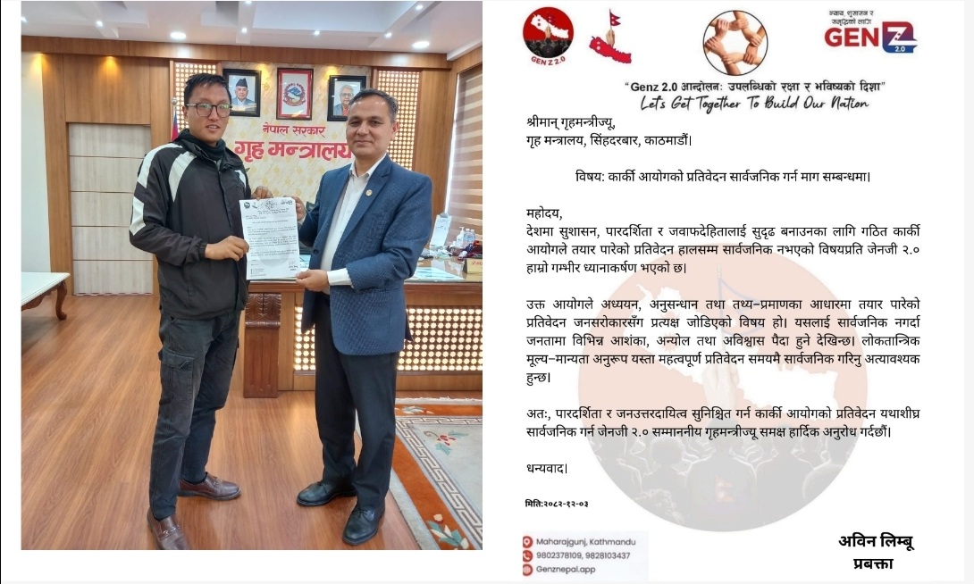 जेनजि २.० ले पारदर्शिता र जनउत्तरदायित्व सुनिश्चित गर्न कार्की आयोगको प्रतिवेदन ढिलाइ नगरी सार्वजनिक गर्न आग्रह गरेको छ।