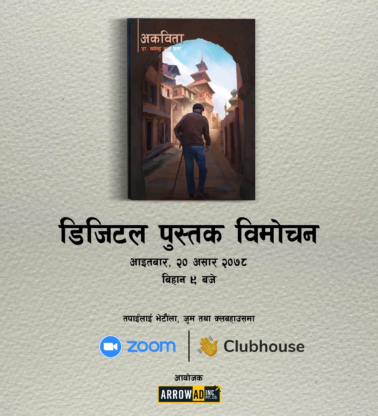 सम्भवतः नेपालमा नै पहिलो पटक आयोजना गरिएको कविता सङ्ग्रहको डिजिटल विमोचन एरो एड इ. प्रा. लि. ले जुम तथा क्लबहाउसबाट सम्पन्न गरेको थियो ।