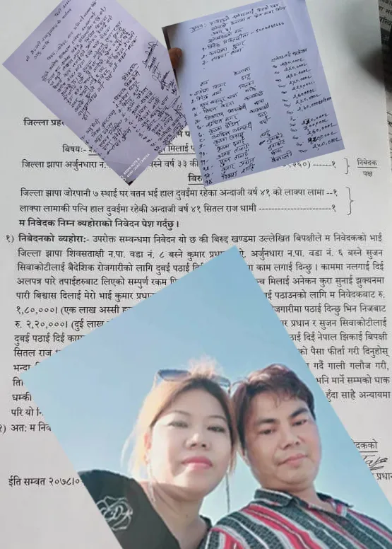 यूएई सम्बाद दाता । झापा जोरपानी ७ का लाक्पा लामाले सर्वसाधारणबाट लाखौं रकम लिएर भिजिट भिजामा यूएई ल्याई अलपत्र पारेको भन्दै नेपाली राजदुतावास अबुधावीमा निवेदन दिएका छन् भने पत्रकारलाई धम्याएकोमा प्रहरीमा उजुरी परेको छ । झापा झिलझीलेका कुमार प्रधानले भने, ‘लाक्पा लामाकी श्रीमती सीतल राजधामी (तामाङ) हाम्रो घरमा आईन्, ३ दिन बसिन्, मेरो साउदी अरबमा […]
