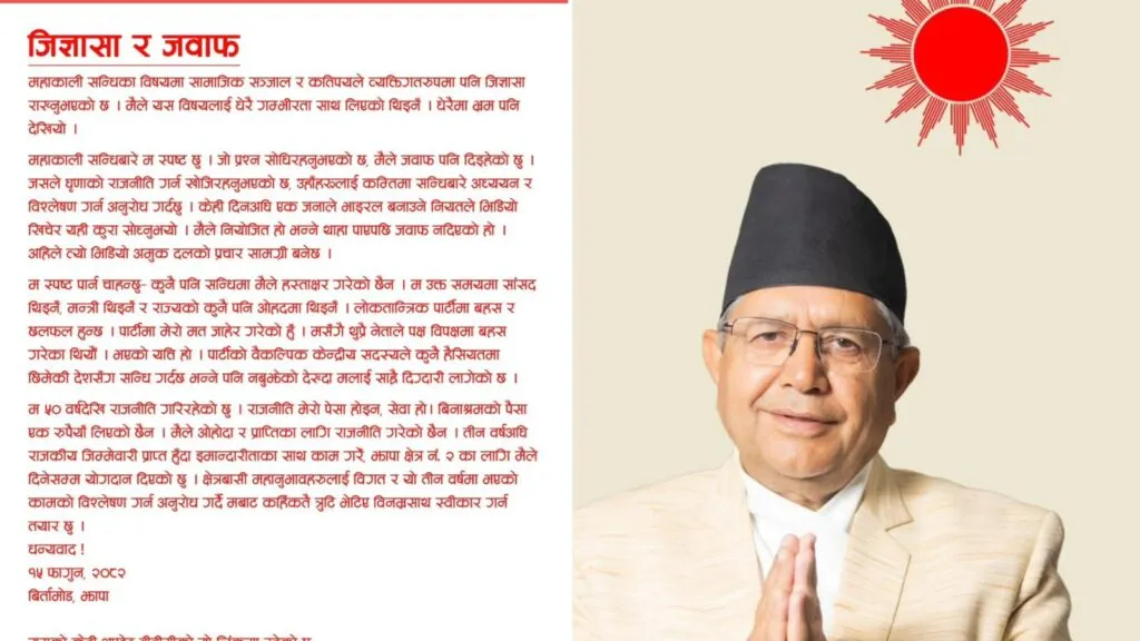 झापा। झापा क्षेत्र नम्बर २ का प्रतिनिधिसभा सदस्यका उम्मेदवार देवराज घिमिरेले महाकाली सन्धिका विषयमा उठिरहेका जिज्ञासाबारे स्पष्टोक्ति दिएका छन्। सामाजिक सञ्जाल तथा व्यक्तिगत रूपमा सोधिएका प्रश्नलाई लिएर उनले आफूले उक्त सन्धिमा कुनै पनि रूपमा हस्ताक्षर नगरेको दाबी गरेका हुन्। घिमिरेले आज जारी गरेको विज्ञप्तिमा महाकाली सन्धिबारे आफू स्पष्ट रहेको र उठेका प्रश्नहरूको जवाफ दिइरहेको उल्लेख […]