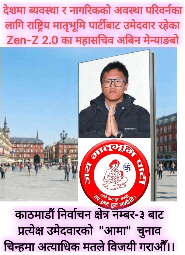 काठमाण्डौ । जय मातृभूमि पार्टीका अविन मेन्याङबो काठमाडौँ निर्वाचन क्षेत्र नं ३ बाट प्रतिनिधि सभा सदस्य उम्मेदवार बनेका छन। आगामीफागुन २१ गते हुने निर्वाचनको लागि मातृभूमि पार्टीका तर्फबाट युवा नेता एवं जेनजी २.० अभियानका प्रवक्ता उनले काठमाडौँ क्षेत्र न. ३ मा उम्मेदवारी दर्ता गराएका हुन् । आमा चुनाव चिन्ह लिई निर्वाचनमा होमिएका अविन मेन्याङबो युवाको आवाज, […]